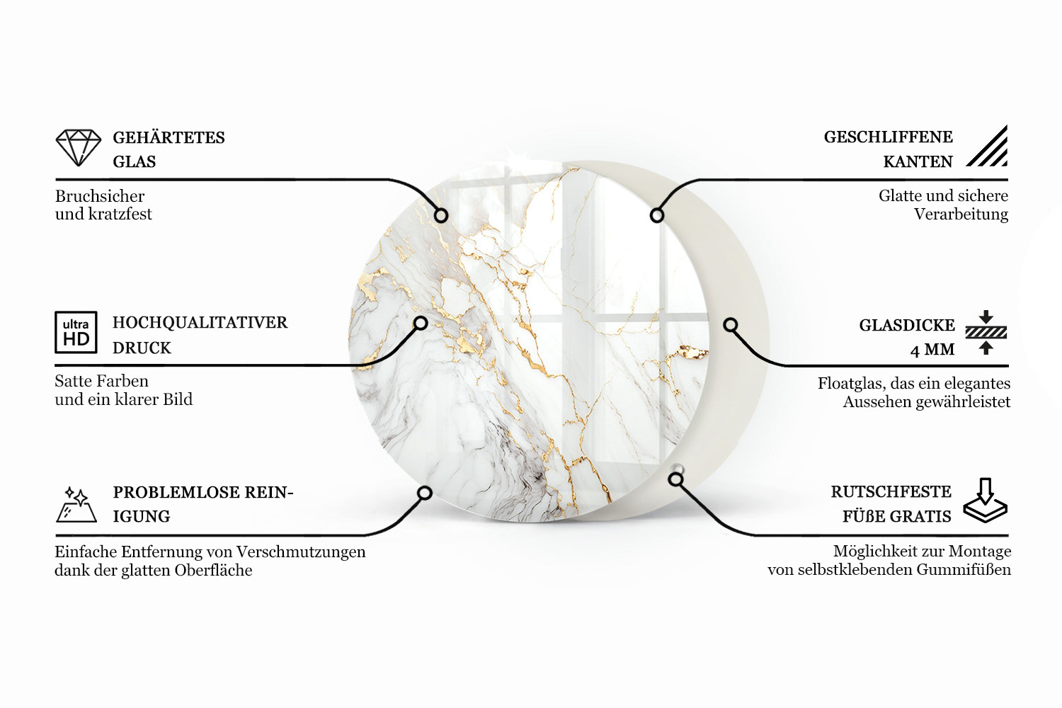 Verleihen Sie Ihrem Interieur einen Designer-Akzent mit einer runden Tischplatte aus Glas mit dem Aufdruck Marmor mit feinen Adern. Dieses Produkt verbindet moderne Form mit dekorativem Ausdruck. Es ist nicht nur eine Tischplatte, sondern ein stilvolles Detail, das den Raum verwandelt und Monotonie durchbricht. Die Glasplatte für den runden Tisch Marmor mit feinen Adern eignet sich perfekt als Couchtisch, eleganter Esstisch oder künstlerische Schutzauflage. Hergestellt aus gehärtetem Glas (Float), ist sie stoß- und temperaturbeständig. Egal ob als Gartentischplatte oder im Wohnzimmer – das Motiv verleiht individuellen Charakter. Wenn Sie mehr als nur Funktionalität suchen, ist diese runde Tischplatte die ideale Wahl für Küche, Wohnzimmer oder Wintergarten.