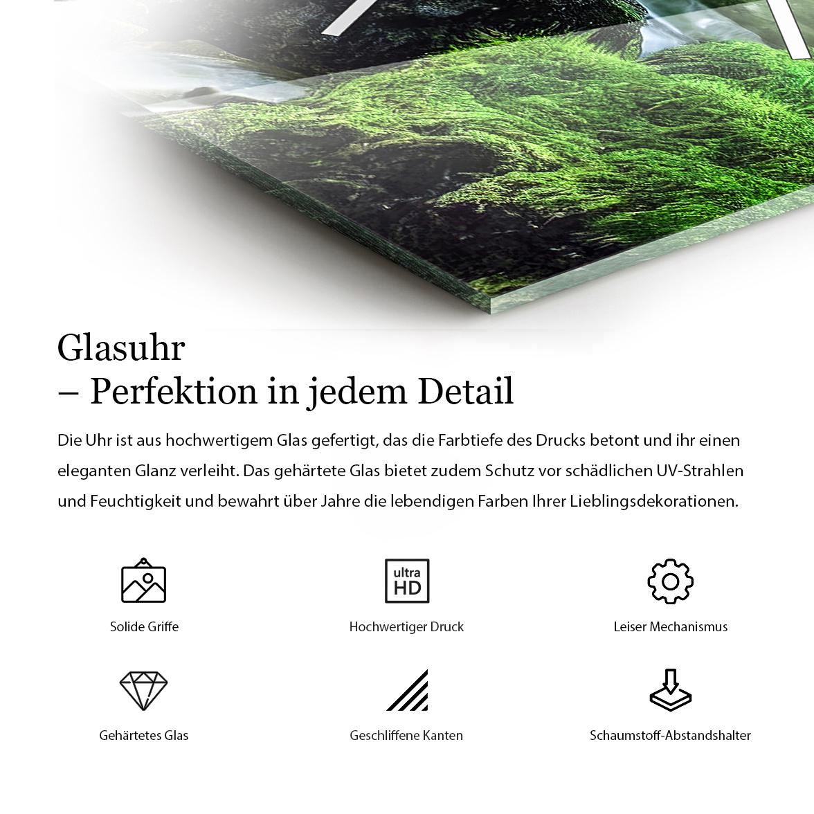Denke daran, dass du eine Glasuhr mit Aufdruck kaufst. Motive wie z. B. Glitzer, Gold, Silber, Beton, Marmor, rostiges Blech usw. sind gedruckt, wodurch sie sich optisch von ihren echten Gegenstücken unterscheiden können.